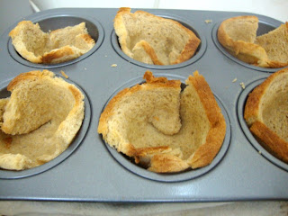 Trim the bread slices, roll them flat using a rolling pin over a board. Press them down into the muffin holes.